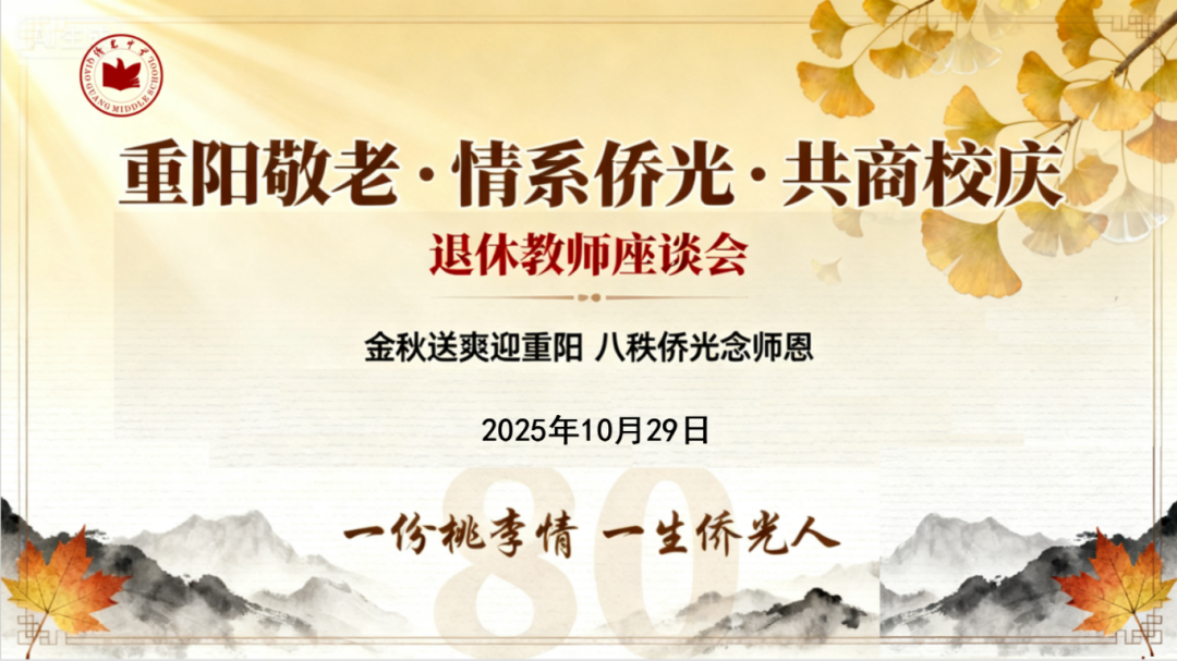 九九重阳节,悠悠侨光情。2025年10月29日上午,侨光中学在雅华楼二楼会议室举行离退休教师座谈会。学校行政与离退休教师们欢聚一堂,共庆佳节,共叙情谊,共谋发展。 座谈会在温馨美好的氛围中拉开帷幕。首先,林建成校长代表学校向全体离退休教师致以节日的问候,欢迎老教师们“回家”,并衷心感谢大家克服困难回母校共度重阳节。他深情表示,学校的发展凝聚着每一位离退休教师的汗水与智慧,离退休教师是学校的宝贵财富,学校永远是离退休教师温暖的家。 会上,林校长从近五年来办学成效、献礼80周年校庆项目推进情况和校庆筹备工作向离退休教师们作了具体汇报,并真心希望大家为学校发展和校庆工作积极建言献策,倡议撰写回忆文章于校庆时汇编,捐赠有意义的物品于校史馆珍藏,并诚挚邀请他们明年秋季回校参加校庆活动! 校董会常务副董事长、侨光中学退教协会会长陈进宝老校长扎根侨光42年,担任校长20年,退休后仍在为侨光无私作奉献。受董事会傳港生主席、叶抑强董事长的委托,陈进宝老校长代表校董会向在座的各位老同事致以节日问候和祝福!并在会上交流三点想法:一是珍爱健康,颐养天年,这是我们的首要任务;二是情系校园,持续关注,这是我们不变的情怀;三是汇聚力量,共庆华诞,这是我们共同的荣光。 座谈会上,与会退休教师个个脸带笑容,深情交流,共叙侨光情怀和同事情谊,共同回忆侨光往事,分享养生经验;同时,他们非常感谢学校提供这个难得的相聚机会,纷纷表示学校的高质量发展是大家共同的心愿,并对学校未来的发展提出一些宝贵的意见和建议。 离退休老师们还兴致勃勃地参观了校园,昔日肩挑手扛建操场,而今塑胶跑道标准化;当年平屋简陋瓦房厝,现在楼馆林立焕然新。他们为学校办学条件日益完善、办学品位不断提升而感到无比欣慰,他们寄语侨光学子要勇于追梦,不负青年,不负侨光! 座谈会在温馨的合影中圆满结束。镜头定格下灿烂的笑容,也凝聚着侨光人对学校的深情与祝福。 秋阳天正好,携手谱新篇。此次座谈会,畅叙了深情厚谊,凝聚了奋进力量,弘扬了尊师重教的优良传统,共同谋划了学校美好的未来。 座谈会由学校工会黄金田副主席主持。 撰稿:侯完肖 编辑:黄怀河 初审:侯完肖、许东伟 复审:王进展、黄金田 终审:黄剑平