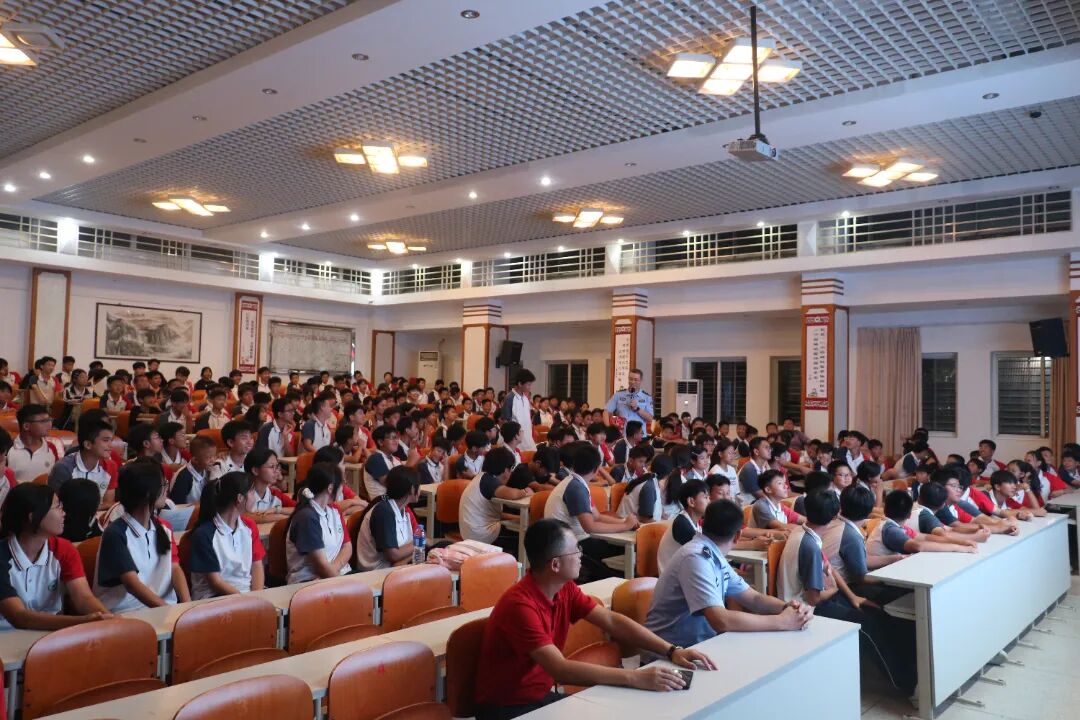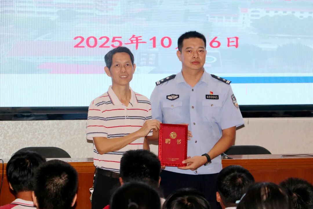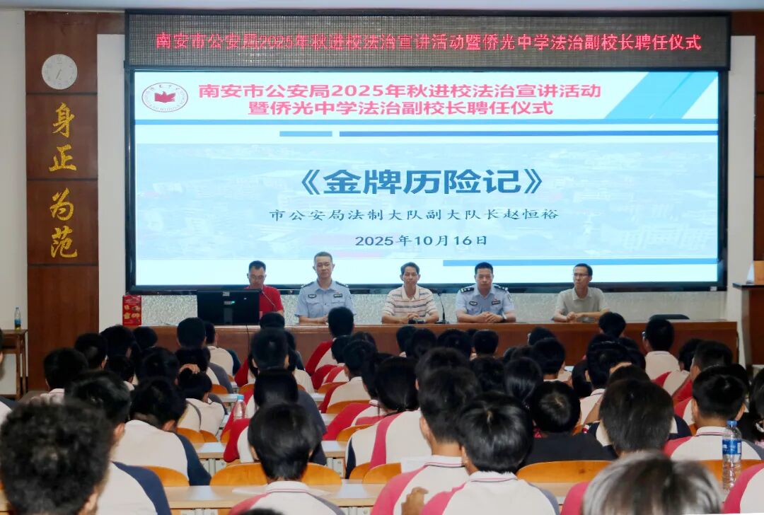 2025年10月16日晚,图书馆教师会议室内座无虚席,不时传出阵阵讨论声与掌声。南安市公安局2025年秋进校法治宣讲活动暨侨光中学法治副校长聘任仪式在此举行,市公安局出入境大队副大队长许金山同志、市公安局法制大队副大队长赵恒裕同志,学校林建成校长等校级领导及初中部340余名师生共同参与这场“有料又有趣”的法治教育活动。 聘书承使命 携手护成长 活动在庄严的聘任仪式中拉开帷幕。林建成校长为许金山同志颁发侨光中学法治副校长聘书。 一纸聘书不仅是荣誉,更承载着双方共同守护青春的约定。此前许队长已多次为校园安全提建议,今后他还将定期参与校园安全研判、法治课堂授课,真正把“护学”落到实处。 金牌历险记 法治入人心 在随后的普法讲座中,赵恒裕副大队长为师生带来生动精彩的《金牌历险记》法治课。 赵队长通过真实案例、情景模拟和互动问答,将复杂的法律知识转化为通俗易懂的“青春攻略”,深刻诠释了“守法才是永不失效的金牌”。同学们在欢笑与思考中,明晰了新修订的《中华人民共和国治安管理处罚法》的变化,增强了法治观念,学会了用法律武器保护自己。 筑牢安全线 护航青春路 本次活动是我校深化“平安校园”建设的重要举措。学校将持续推进法治教育常态化、特色化,让法治精神在校园落地生根,为每一位侨光学子的健康成长筑牢安全防线,让法治之光点亮青春梦想! 撰稿:校融媒体中心 初审:陈志坚 终审:陈东红