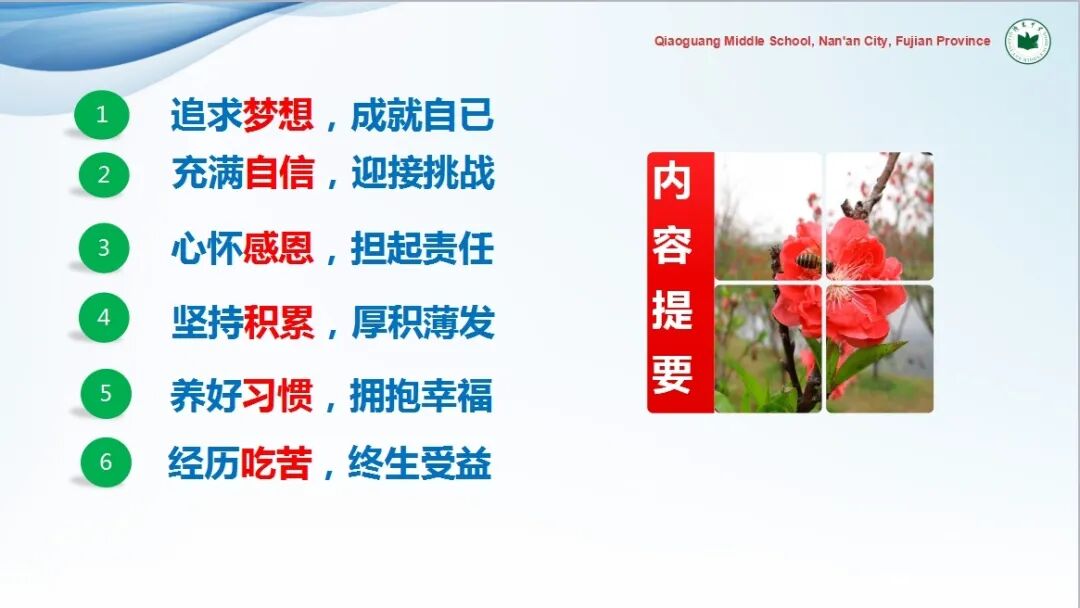 金秋送爽迎学子,丹桂飘香启新篇。2025年8月31日下午,侨光中学2025级高一年新生开学典礼在菲华体育馆举行。林建成校长等校级领导、支委会委员,相关行政以及高一年全体师生出席。 典礼在雄壮的国歌声中拉开了帷幕。 林建成校长以“梦想 自信 感恩 积累 习惯 吃苦”为主题作开学动员报告。 首先,林校长向高一新生们致以热烈欢迎与诚挚祝贺。随后,林校长从学校的历史讲起,深情回顾了创校的时代背景与办学初心,系统梳理了学校的发展历程,并重点展示了以高考品牌为核心的办学特色与成果。 接着,林校长从六大方面作了全面动员:追求梦想,成就自己;充满自信,迎接挑战;心怀感恩,担起责任;养好习惯,拥抱幸福;坚持积累,厚积薄发;经历吃苦,终身受益。最后,林校长勉励同学们以新学期为新起点,勇毅踏上成长新征程,让逐梦过程绽放光彩,让圆梦成果闪耀青春。 高一年段主抓行政陈明正代表高一年全体教师欢迎同学们加入侨光大家庭,并提出六点希望:一要树立远大志向,明确奋斗方向;二要锤炼高尚品格,涵养优良德行;三要常怀敬畏感恩,懂得珍惜回报;四要养成良好习惯,夯实成长根基;五要保持积极心态,从容面对起伏;六要学会合作共进,凝聚前行力量。 下年段行政、教务处副主任陈桂森宣读中考优秀学生名单。 中考优秀学生上台领奖。林校长等校级领导共同为他们颁奖。 陈艺辉老师的发言温情而有力,他指出,高中阶段的“不确定性”是成长的珍贵契机,鼓励同学们勇敢正视挑战。并以“目标为帆、习惯为桨、坚持为舵”为喻,期待同学们在侨光淬炼自我,绽放光芒,温暖同行。 高一新生代表黄子惠同学的发言满怀感恩,她回顾在侨光的成长历程,鼓励同学们以壮志立心、以勤勉立身、以知行合一践行理想,携手同窗、师长与家人,在侨光这片沃土书写青春华章。 2025届高三优秀毕业生代表傅凌峰同学作分享发言。他围绕侨光中学“严谨,求是,进取”的校训,从“衔接适应、学习方法、心态调整”三个维度,为新生分享了干货满满的高中适应指南。 典礼尾声,在高一15班叶可馨同学的带领下,同学们集体宣誓,以庄严承诺开启高中新篇。 典礼由政教处副主任叶志灵主持。 以梦为帆启新程,以勤为浆绘华章。此次开学典礼既是迎接2025级高一新生的温暖仪式,更是赋能成长的精神动员。相信全体新生定能将师长的殷切嘱托化作前行力量,以今日为起点,笃行不怠、逐光而上。 撰稿:郭燕萍 编辑:黄怀河 初审:叶志灵 复审:陈桂森 终审:陈明正 公众号:naqgzx